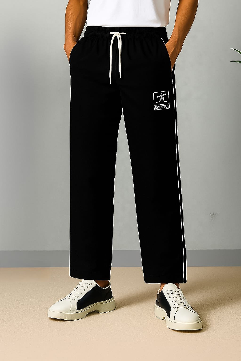 Step into comfort and style with these black Sportus track pants, designed for active and casual wear. Featuring a straight-leg fit with white side stripes, an elastic waistband with a drawstring for adjustable comfort, and a bold “SPORTUS” logo on the left thigh, these pants combine sporty aesthetics with everyday practicality. Pair them with sneakers and a tee for a relaxed, athletic look.