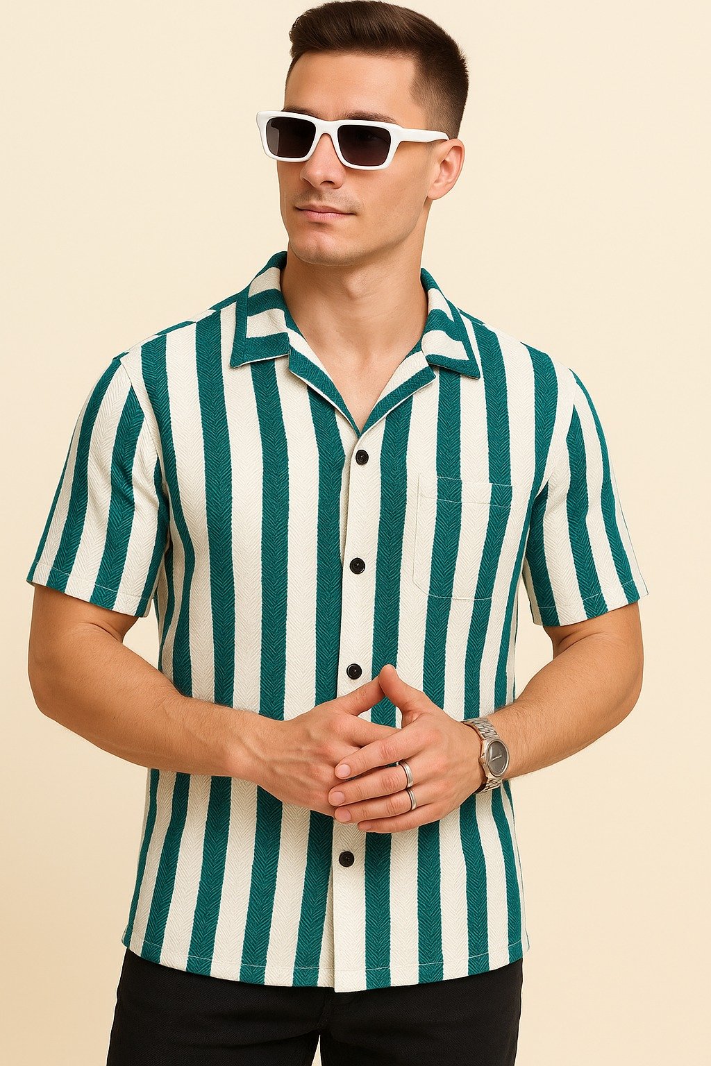 Add a bold touch to your wardrobe with this stylish green and white vertical striped shirt. Featuring a relaxed fit, open camp collar, and button-down front, this short-sleeve shirt brings vintage flair with modern confidence. Made from textured fabric for added character, it includes a chest pocket for functionality. Ideal for summer outings, beach vacations, or casual hangouts, it pairs perfectly with black or white trousers and standout accessories like retro sunglasses.