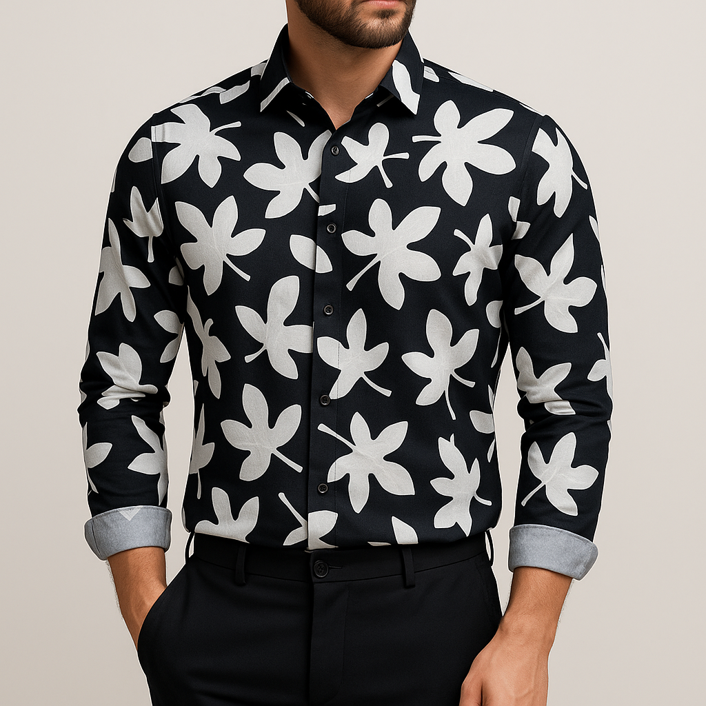 Make a bold fashion statement with this luxurious men’s printed corduroy shirt by Fourteen. Crafted from premium-quality corduroy fabric, this shirt offers both comfort and sophistication. The striking white leaf print over a rich black base is perfect for casual and semi-formal occasions. Designed with attention to detail, the shirt features a structured spread collar, contrast inner cuff, and a tailored slim fit that complements the modern man’s wardrobe.